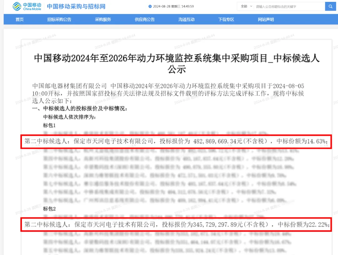 近日,保定市天河電子技術有限公司以兩個第二名的優(yōu)異成績,成功中標中國移動2024-2026年動力環(huán)境監(jiān)控系統(tǒng)集采項目的匯聚機房與核心機樓雙標段。